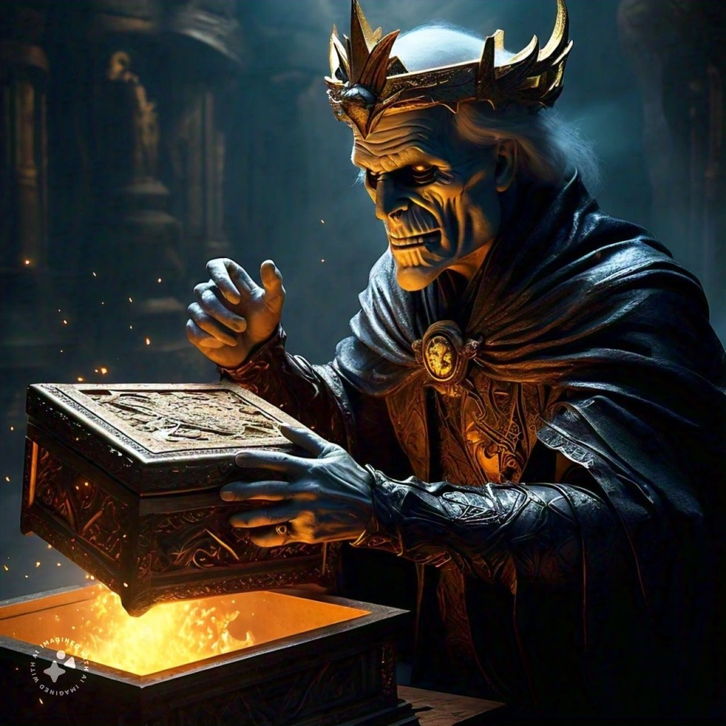 He pulls out an ancient, sinister-looking locked Box, and brings it to his desk.