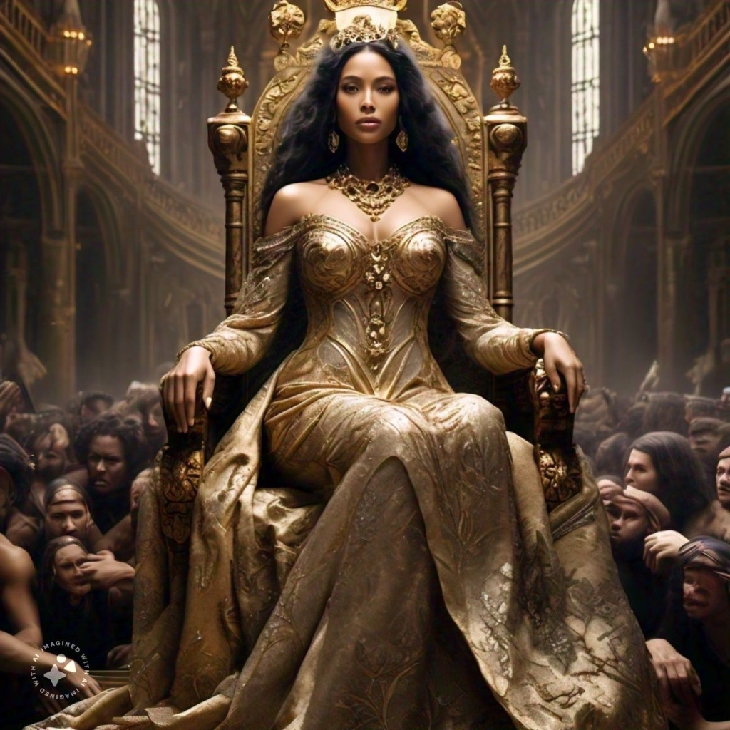 She is wearing a white robe, and seated on a massive throne that towers over us.