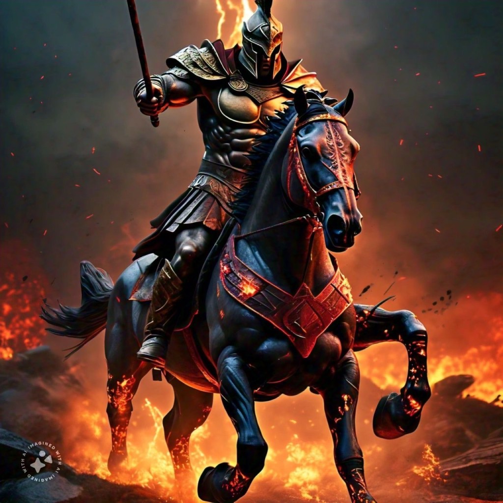He whistles, and a fiery black horse thunders close. He mounts in a single fluid motion.