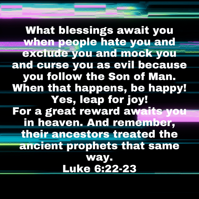 “What blessings await you when people hate you and exclude you and mock you and curse you as evil because you follow the Son of Man. When that happens, be happy! Yes, leap for joy! For a great reward awaits you in heaven. And remember, their ancestors treated the ancient prophets that same way.”