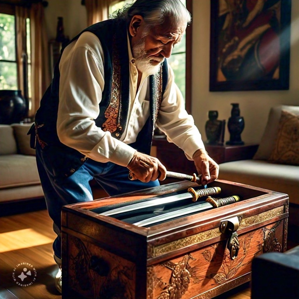 [With the vigor of a man half his age, he dashes to a darkened corner of the hut. After a series of thudding and scraping sounds, he emerges bearing three wondrous swords. Improbably bright and clean, as if they had been lovingly oiled and polished every night for a generation.]
