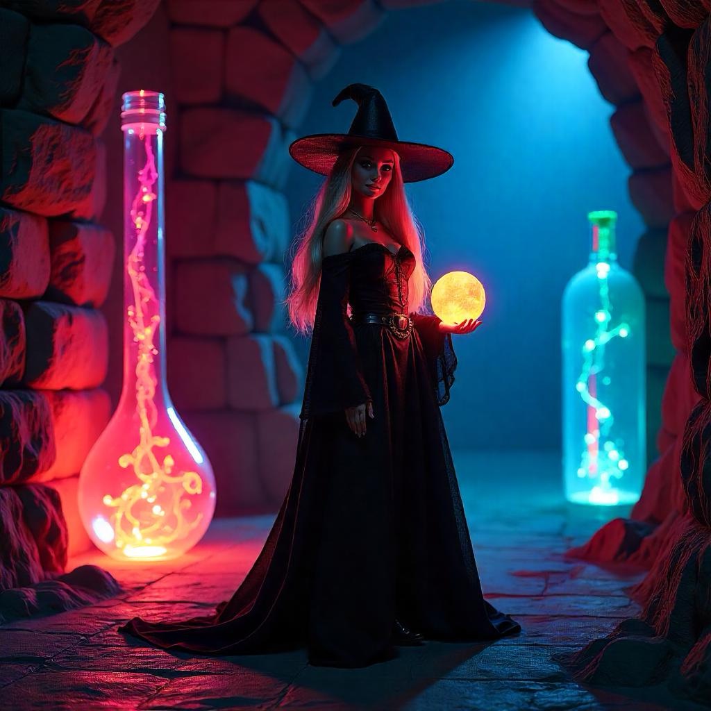 She steps forward and taps the broomstick on the floor. Instantly, the chamber is transformed into a throne room, the angry furnace becoming a cheery fireplace. Her black robes become a pink ball gown.