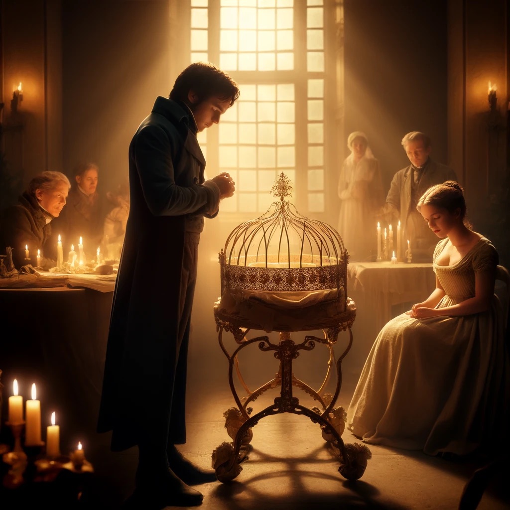 The setting is intimate, a quiet Christmas Eve in the Pontmercy home. A small group of family and close friends gather around a cradle holding Marius and Cosette’s newborn son, Jean. Marius stands, reflective, addressing those present with quiet reverence.