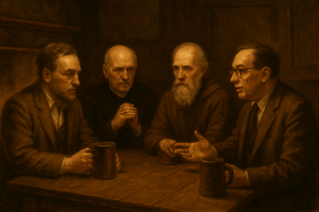 The Eagle and Child pub’s back room. Firelight, the smell of ale and old books. C.S. Lewis (“Jack”) sits with a pint. Anselm of Canterbury, Athanasius of Alexandria, and Karl Barth join him at the table.