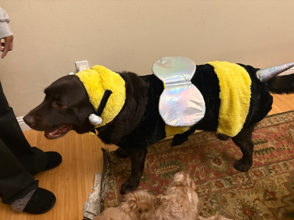 Our dog Frolic in a bee costume (which my daughter chose yesterday, not knowing about my blog series)