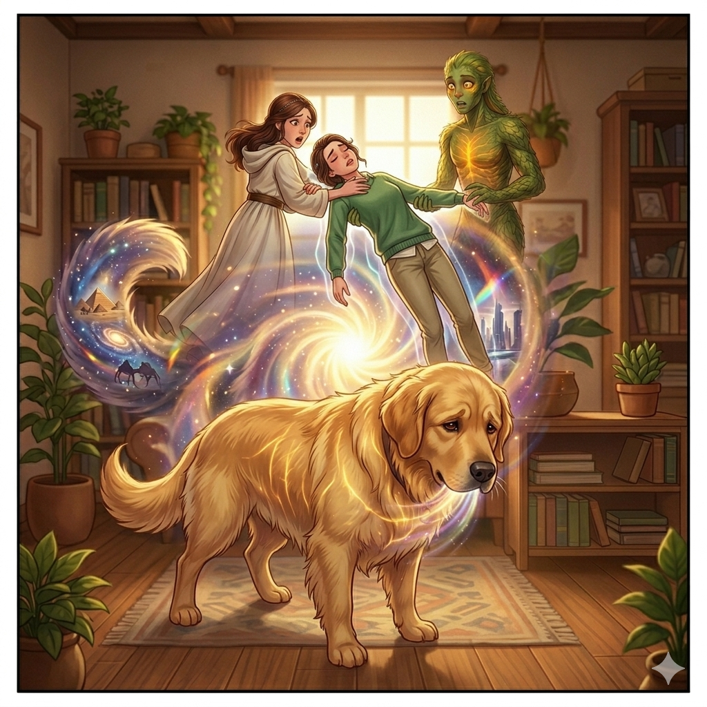 From the outside, it looks like a scaly green monster is attacking the cute, defenseless puppy.